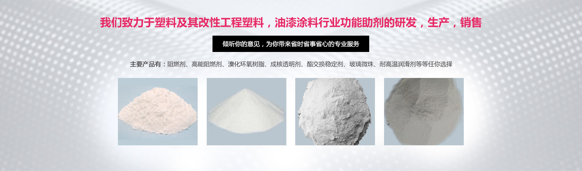 公司全心致力于以下幾個(gè)領(lǐng)域:阻燃劑在工程改性塑料的運(yùn)用,鹵素及其無(wú)鹵